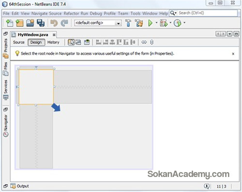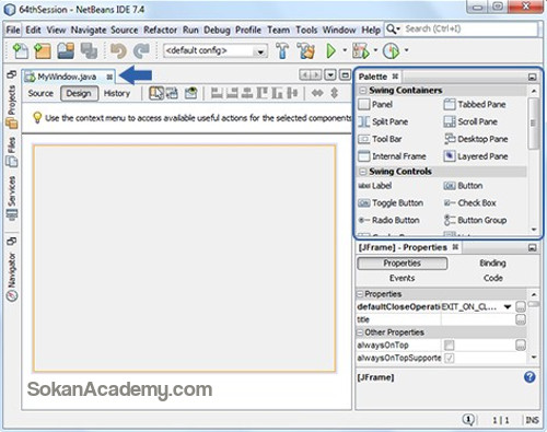 علاوه بر این می توان Component هایی همچون JFrame را در دو حالت Source و Design نمایش داد. منظور از Source این است که کدهای این کلاس نمایش داده شوند و منظور از Design این است که نمود عینی کدهای جاوا به نمایش درآیند. برای این منظور همانطور که در تصویر زیر نشان داده شده است با کلیک بر روی هر یک از Tab های Source و Design می توان به چنین قابلیتی دست یافت: