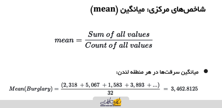 آیا با استفاده از نمودار بالا میتوانیم مقدار متوسط تخلفات وسایل نقلیه را محاسبه کنیم؟ پاسخ به این سوال نیازمند محاسبه مقدار متوسط دادهها است که بهطور معمول از طریق تصویرسازی دادهها مانند هیستوگرام قابل دستیابی نیست. در عوض، برای این منظور میتوانیم از آمار توصیفی و محاسبه شاخصهای آماری بهره بگیریم. یکی از روشهای رایج برای محاسبه مرکز دادهها، استفاده از میانگین است. میانگین، بهعنوان سادهترین روش برای توصیف مرکز دادهها، بهراحتی با جمع کردن تمامی مقادیر و تقسیم آن بر تعداد کل دادهها محاسبه میشود. بهعنوان مثال، برای محاسبه میانگین تعداد سرقتها در هر منطقه از لندن، تمامی مقادیر جمع میشوند و سپس بر تعداد مناطق تقسیم میشوند.