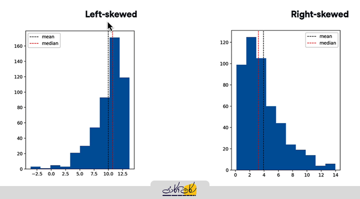 اما در مقابل، اگر نموداری داشته باشیم که دادهها به یک سمت انباشته شده و یک یا چند داده با مقادیر بسیار متفاوت از بقیه وجود داشته باشد، این نمودار دیگر متقارن نیست.