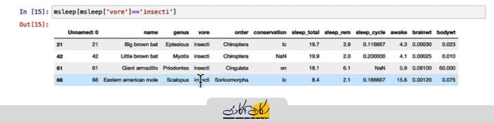 در مجموعه دادهی حیوانات، رژیم غذایی به چهار دسته تقسیم میشود. حالا فرض کنید که میخواهیم حیوانات حشرهخوار را از دادهها جدا کنیم. برای این کار، میتوانیم از کد زیر استفاده کنیم که حیواناتی که رژیم غذایی آنها حشرهخوار است را فیلتر میکند: