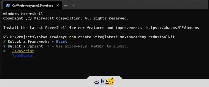 پس از انتخاب React، از شما پرسیده میشود که پروژه با JavaScript ایجاد شود یا TypeScript.در این مرحله، گزینه JavaScript را انتخاب میکنیم.
