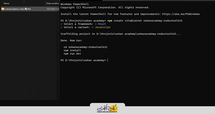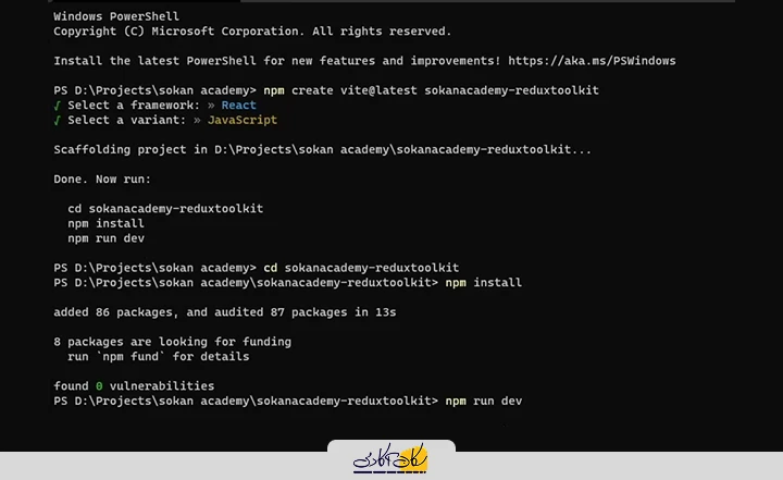 در ادامه، دستور مربوط به نصب Redux Toolkit را از مستندات کپی کرده و وارد پوشه پروژه میشویم. سپس ترمینال را در همان مسیر باز کرده و دستور را اجرا میکنیم.در این مرحله، توجه داشته باشید که Redux Toolkit فرآیند کار با Redux را بسیار سادهتر کرده است؛ اما در کنار آن، به پکیج اصلی Redux و همچنین React Redux نیز نیاز داریم. بنابراین، هر دو پکیج زیر را نصب میکنیم