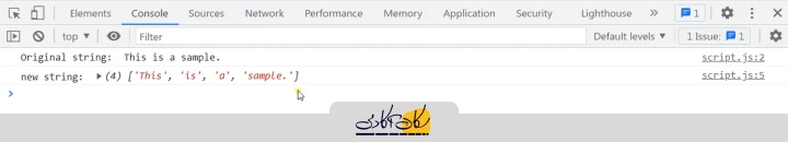 console.log("new string: ", newStr);اگر هیچ آرگمانی به ()split داده نشود، کل رشته به یک عضو آرایه تبدیل میشود. نتیجه میشود: