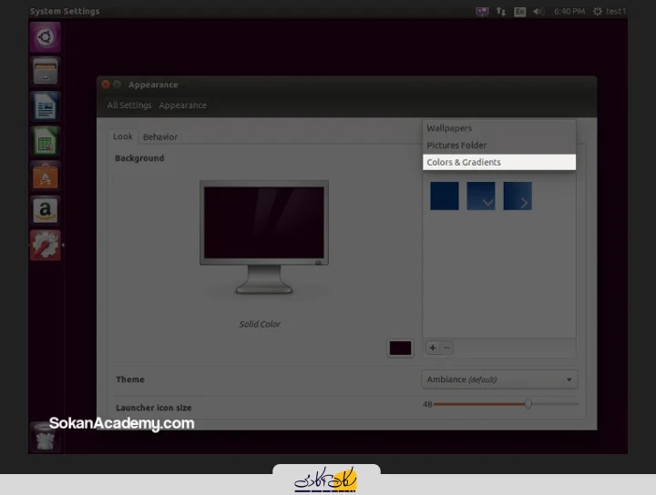 به منظور تغییر تصویر پیش فرض انتخاب شده برای بک گراند سیستم عامل اوبونتو، ابتدا روی آیکان پاور کلیک کرده سپس گزینه ی System Settings را انتخاب نمایید. با انتخاب گزینه ی Appearance، میتوانید کلیه ی تنظیمات مرتبط با ظاهر محیط دسکتاپ خود را تغییر دهید که از آن جمله میتوان به رنگ/تصویر بک گراند، تم دسکتاپ، اندازه ی آیکان ها و غیره اشاره کرد (به عنوان راهکاری جایگزین، میتوانید در هر جایی روی دسکتاپ کلیک راست نموده سپس گزینه ی Change Desktop Background را انتخاب نمایید.)