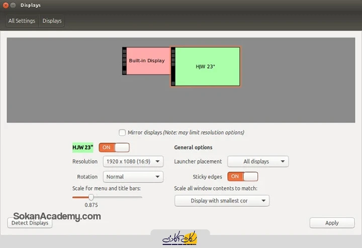 پنل System Settings این امکان را به کاربران لینوکسی میدهد تا بسیاری از تنظیمات اولیه ی سیستم و تنظیمات مرتبط با دسکتاپ را انجام دهند که از آن جمله می توان به تنظیمات مربوط به صفحه ی نمایش اشاره کرد. بخش Displays در پنل System Settings این امکان را به ما میدهد تا تنظیمام مربوط به صفحه ی نمایش همچون رزولوشن و … را انجام دهیم (البته توجه داشته باشیم که معمولاً سیستم به صورت خودکار بهترین رزولوشن را بسته به نوع مانیتور انتخاب میکند گرچه گاهی اوقات در محاسبات خود در این رابطه نیز دچار اشتباه میشود و رزولوشنی اشتباه را انتخاب می کند!)