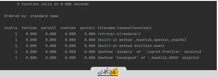 cProfile.run("hashlib.sha256(b'Example of code profiling with cProfile').hexdigest()")