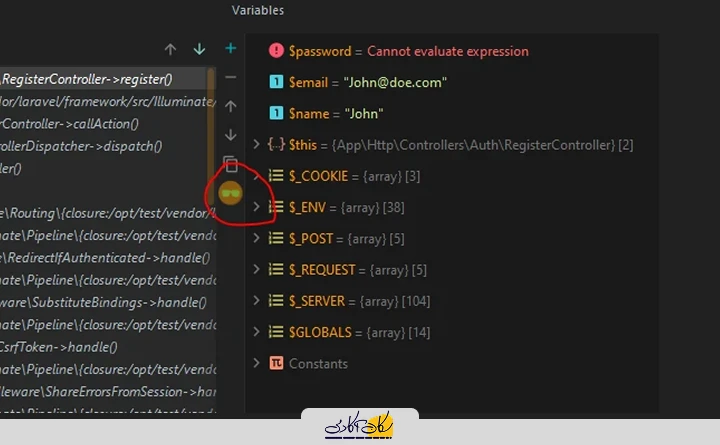 می توانیم stack trace برنامه را مشاهده کنیم و در قسمت variable