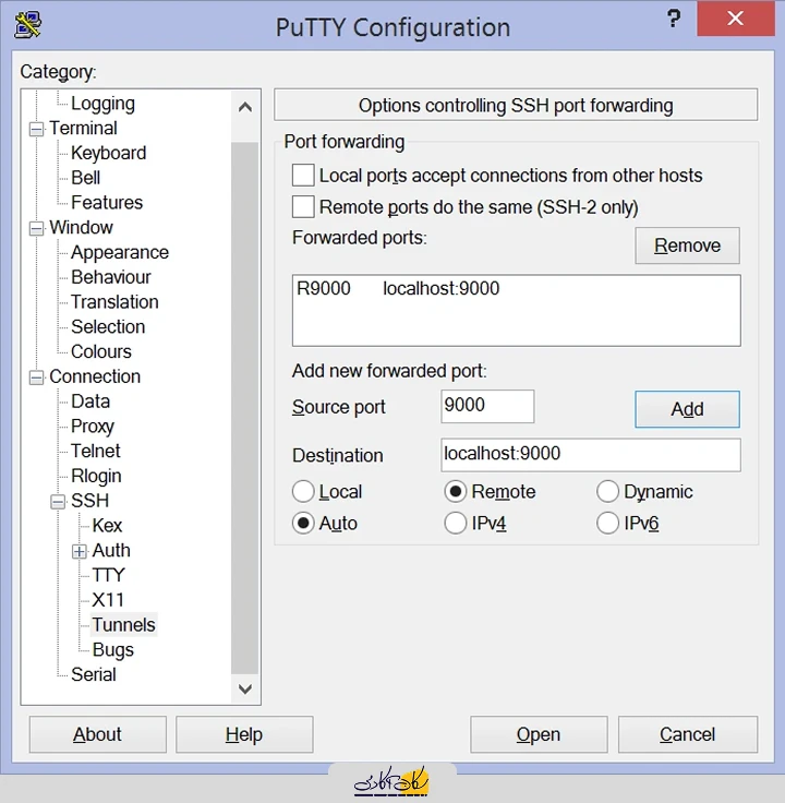 سپس به مسیر Connection | SSH | Tunnels بروید و مانند شکل زیر این ارتباط را برقرار کنید: